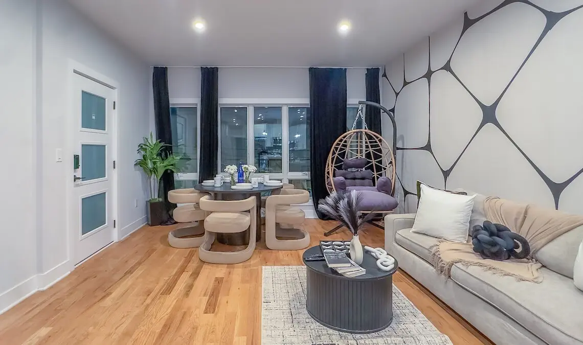 The open-concept living room is the heart of your home-away-from-home: bright, airy, and effortlessly chic. Stretch out on the plush sectional for an afternoon nap, catch up on your favorite series on the Smart TV, or curl up in the velvet accent chair with a good book. The aesthetic is clean, calming, and modern—designed for real life, whether that’s movie night, remote work, or family downtime.